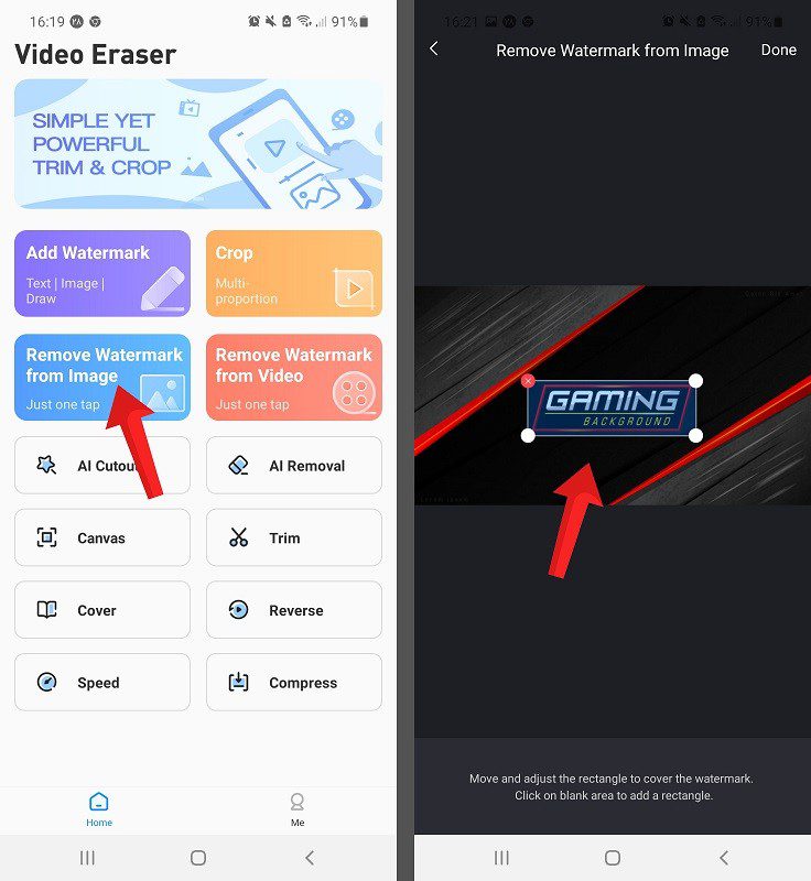 ۲- برای پاک کردن لوگو از روی تصاویر کافی است که روی گزینه Remove Watermark From Video بزنید، پس از آن نیز عکس مورد نظر را از گالری انتخاب کنید و در مرحله بعد کادر موجود را روی واترمارک قرار دهید و گزینه Done را بزنید.