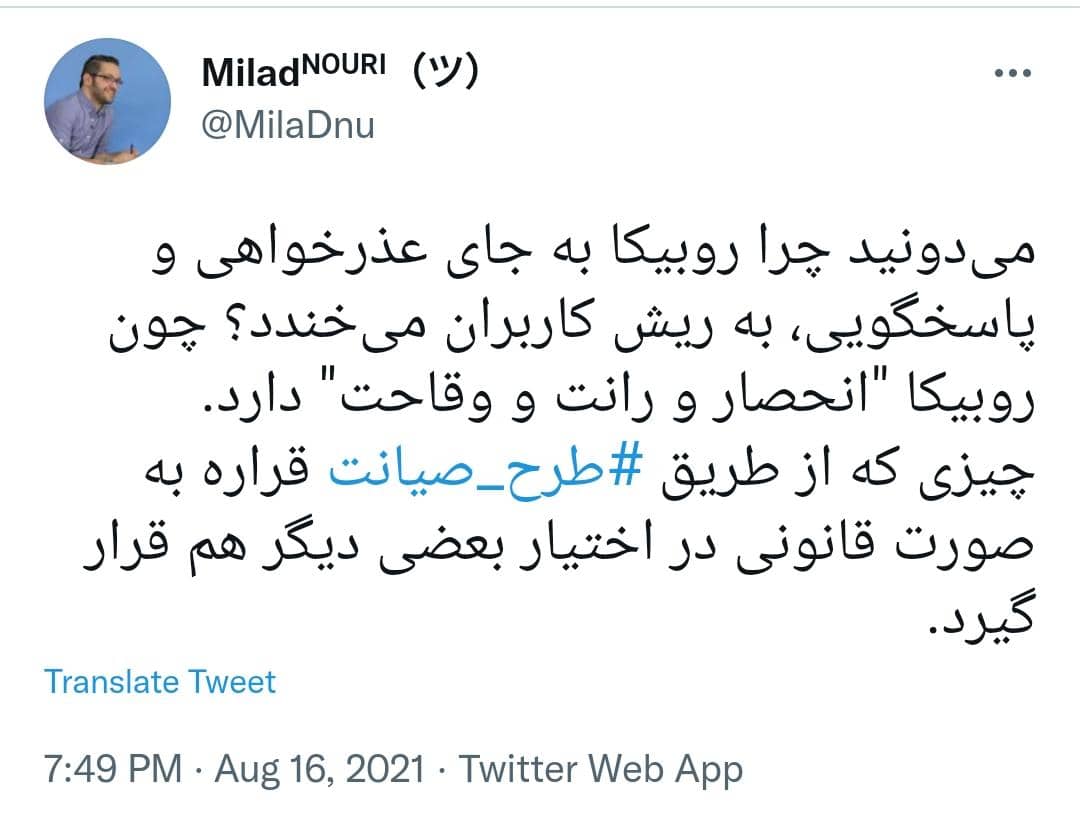 میلاد نوری درباره این موضوع در توییتر نوشت: «میدونید چرا روبیکا به جای عذرخواهی و پاسخگویی به ریش کاربران میخندد؟ چون روبیکا انحصار و رانت و وقاحت دارد. چیزی که از طریق طرح صیانت قرار است به صورت قانونی در اختیار برخی دیگر نیز قرار گیرد.»