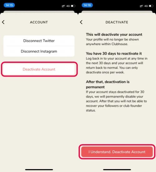برای آموزش نحوه دیلیت اکانت کلاب هاوس ابتدا این اپلیکیشن را باز کنید و به کمک مراحلی که در ادامه این بخش معرفی میکنیم حساب خود را DeActivate کنید. به این نکته توجه داشته باشید که پس از دیاکتیو کردن حساب کاربری، تنها سی روز فرصت دارید تا دوباره حساب خود را دوباره فعال کنید. پس از سپری شدن این مدت سی روزه، کلاب هاوس به طور دائمی حساب کاربری شما را حذف خواهد کرد و دیلیت اکانت کلاب هاوس اتفاق خواهد افتاد.