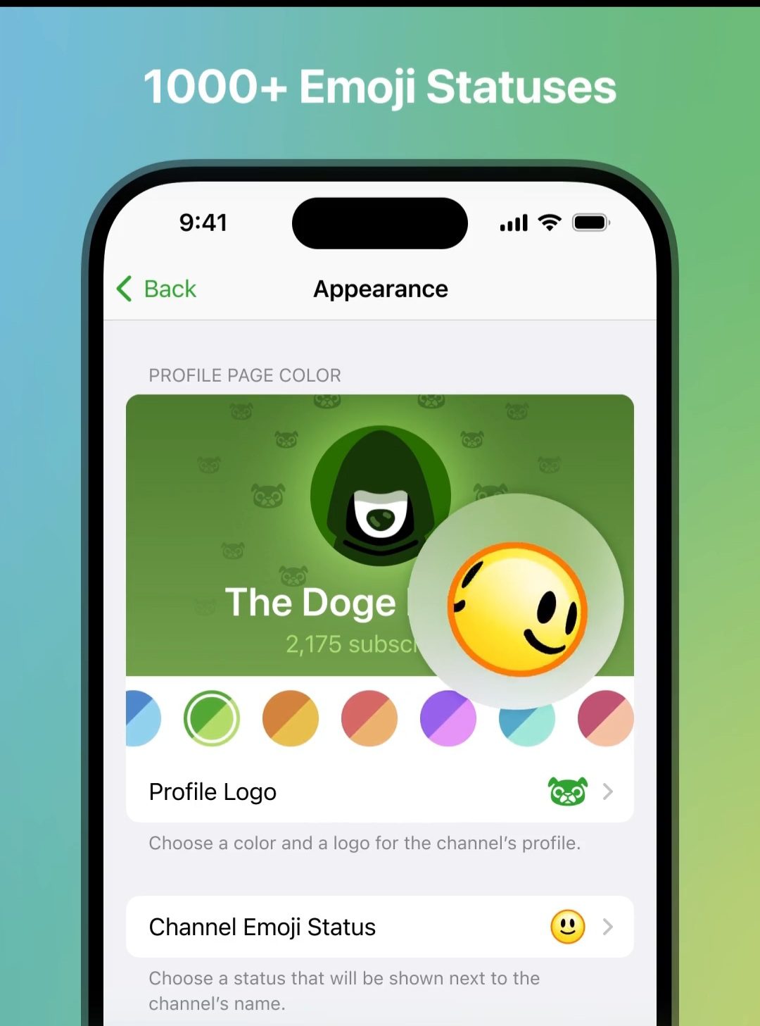 کانالها میتوانند برای وضعیت ایموجی خود، از بین هزاران ایموجی ساخته شده توسط هنرمندان تلگرام، هر چیزی را از یک آدم برفی متحرک تا یک هاتداگ مرموز در کنار نام کانال اضافه کنند.