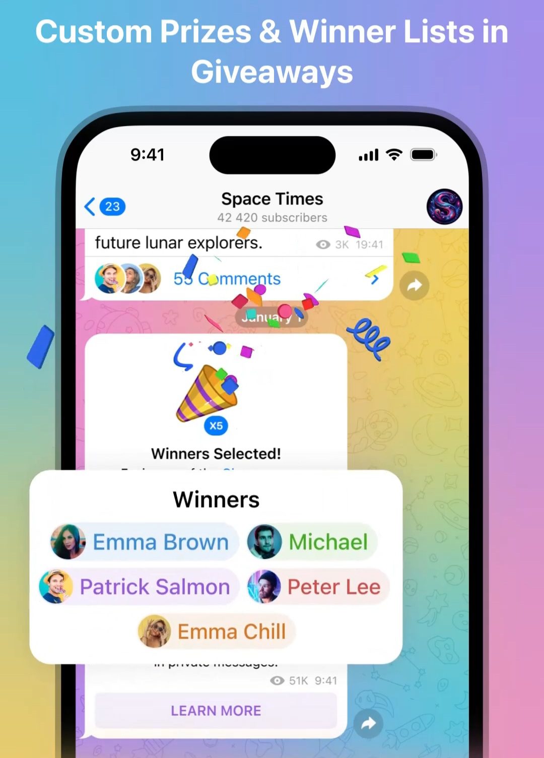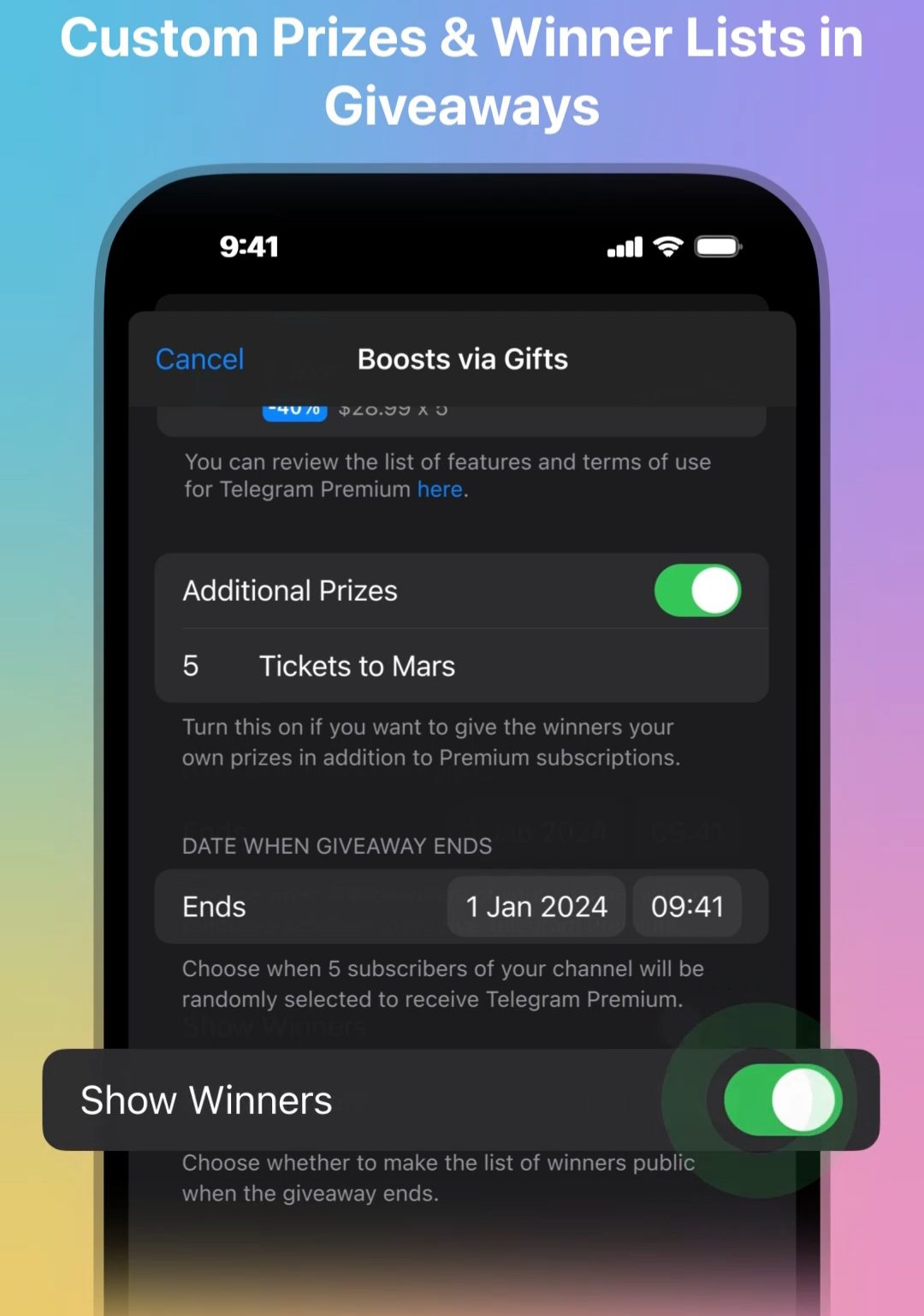 برای شفافیت بیشتر، این کانالهای هدیه میتوانند «show winners» را تغییر دهند تا حسابهایی که برنده شدهاند را اعلام کنند. اگر این ویژگی فعال باشد، برندگان خوششانس در یک پیام جدید پر از کانفیتی معرفی میشوند.