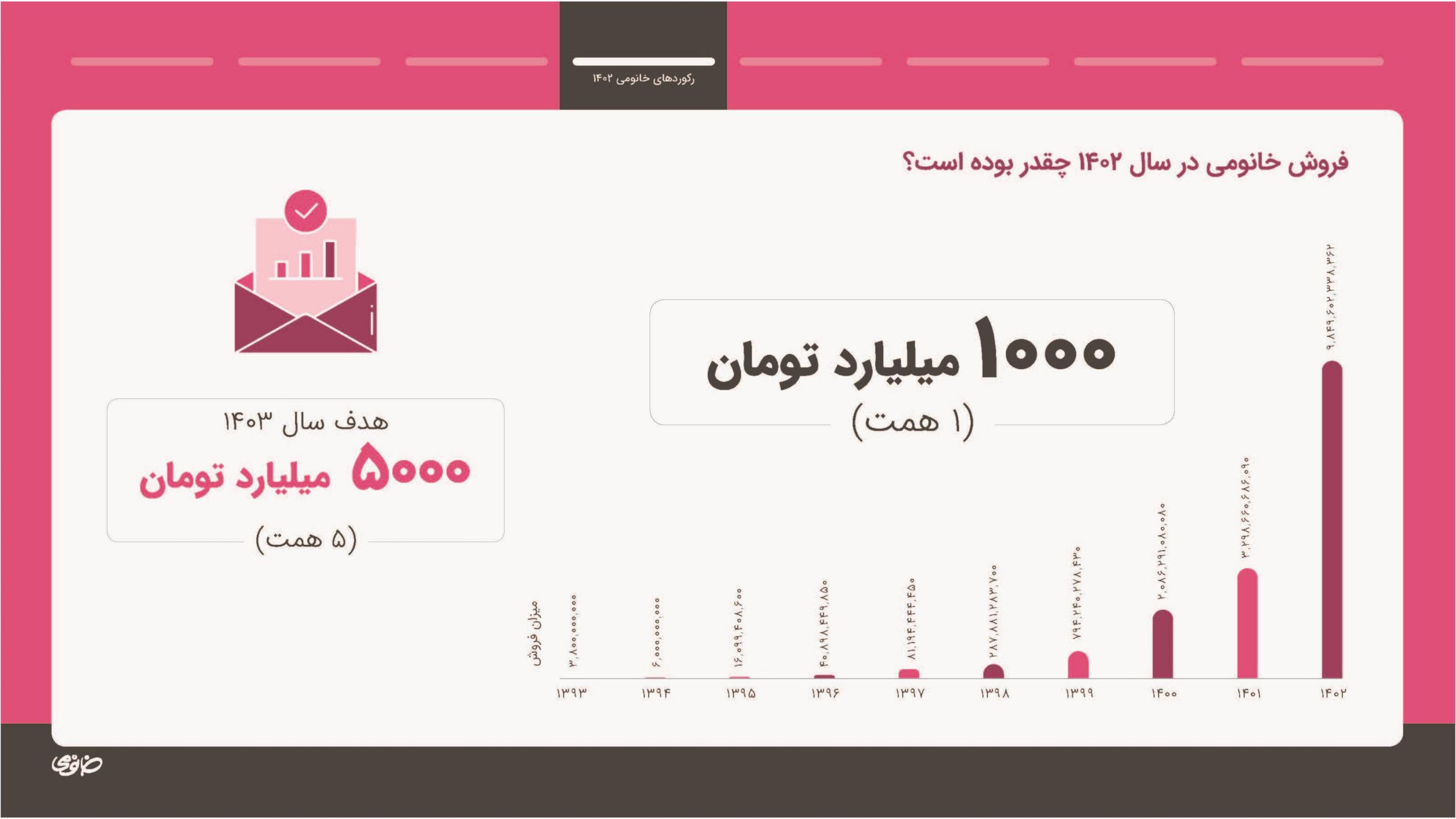 طبق گفته شاهمرادی فروش خانومی در سال ۱۴۰۲ هزار میلیارد تومان اعلام شده و برنامه آینده بنیانگذاران خانومی افزایش ۵ برابری این آمار و رسیدن به عدد ۵ همت است.