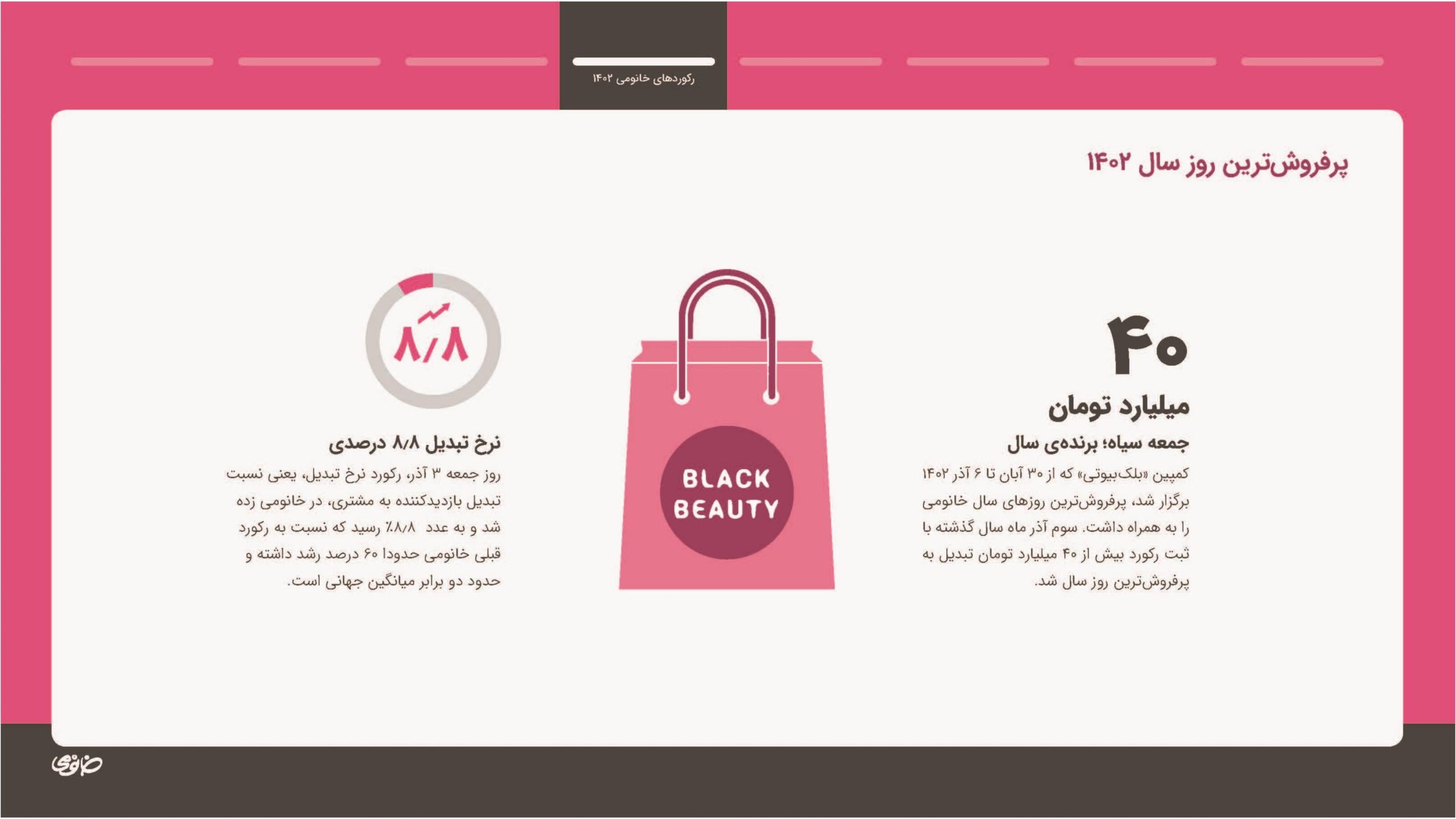 در ادامه کمپین بلک بیوتی 1402 به فروش بیش از 40 میلیارد تومانی خانومی از این روز اشاره شد که از این عدد شگفت زده و راضی بودن به نسبت سایر روز ها که یک دهم این میزان فروش را تجربه کرده بودن.
