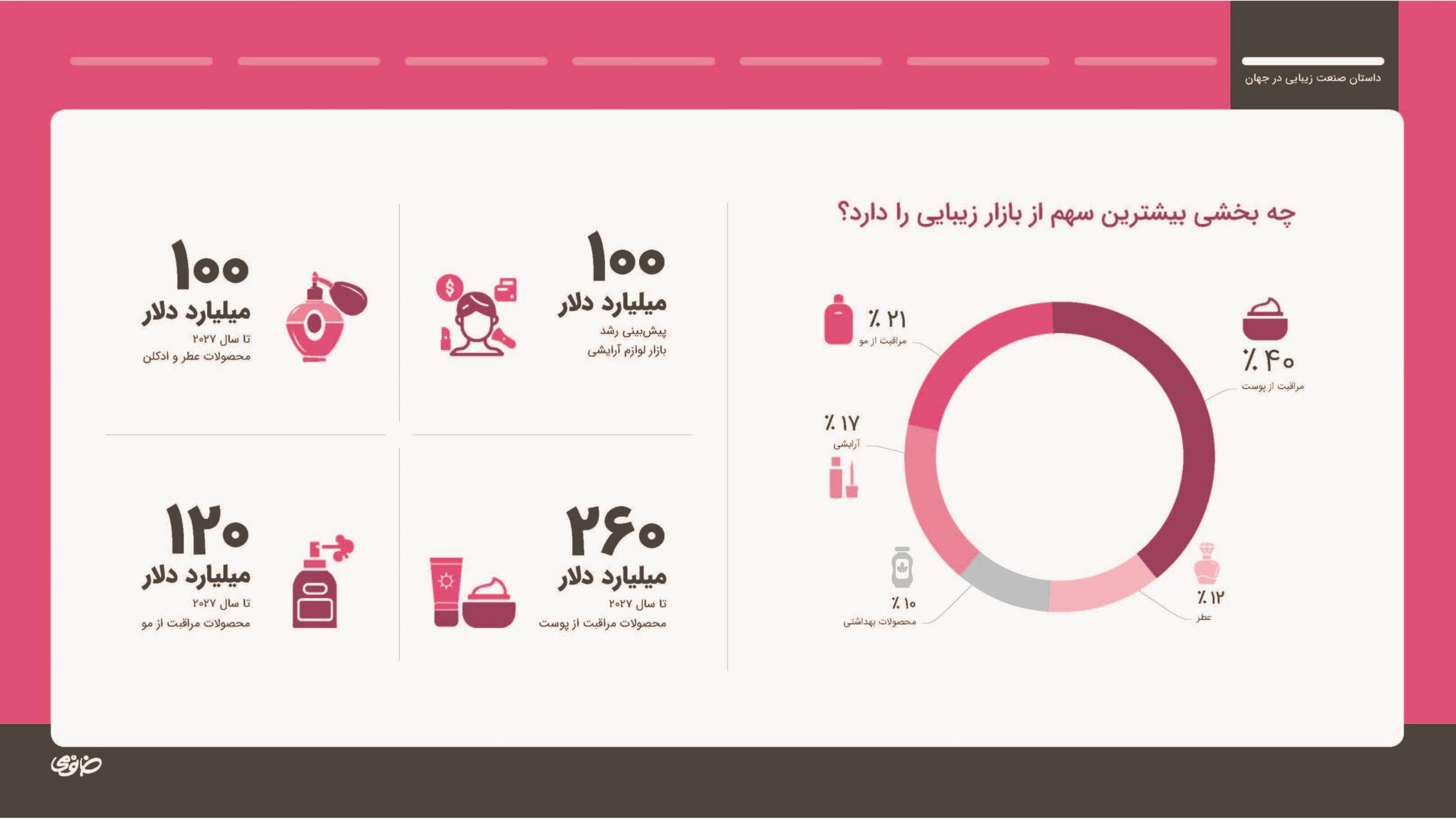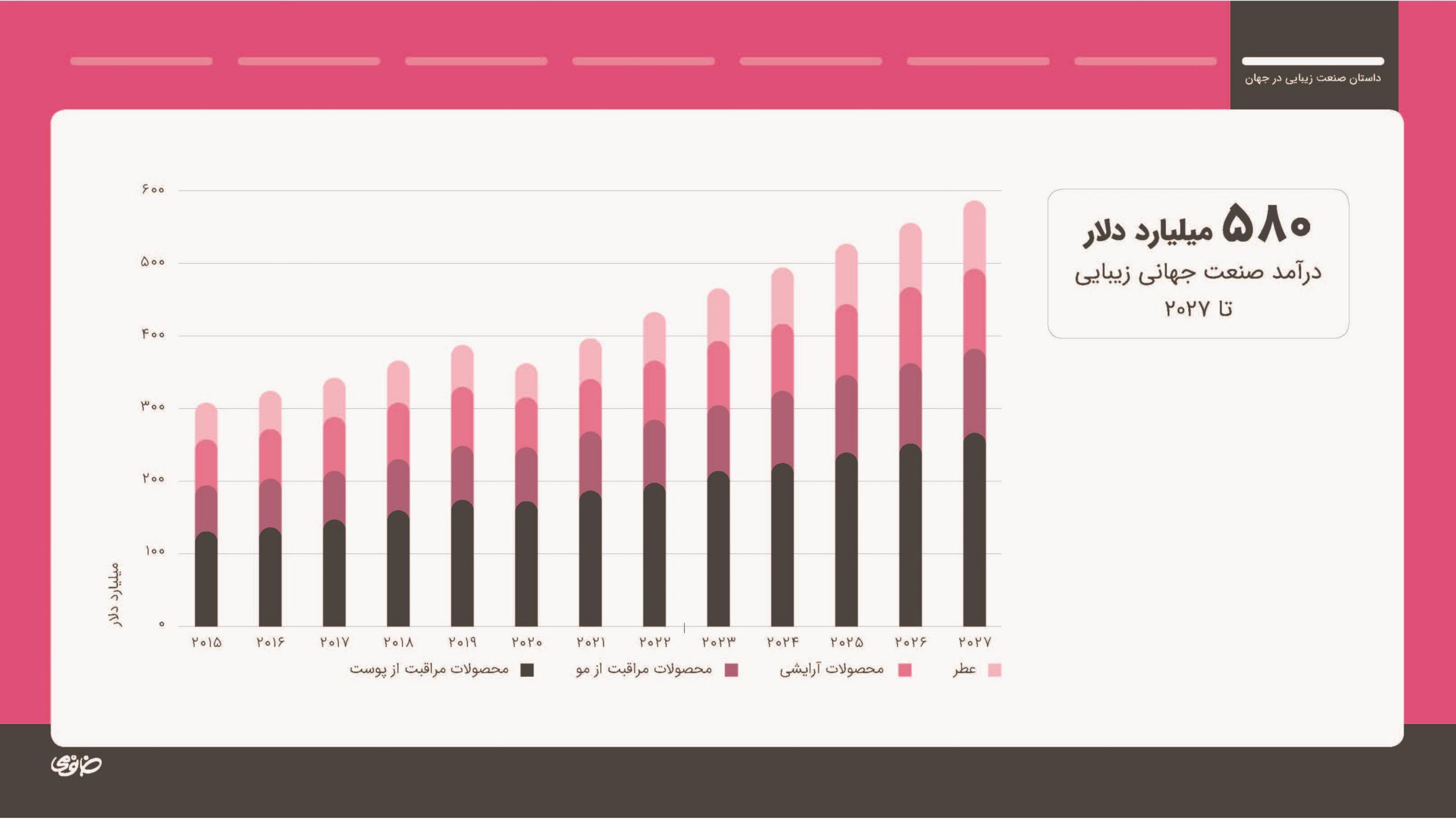 همچنین در ادامه افزودن بیش از 61 درصد از این درآمد بابت مراقبت از پوست و مو است که 260 میلیارد دلار درآمد حاصل از مراقبت های پوستی و همینطور